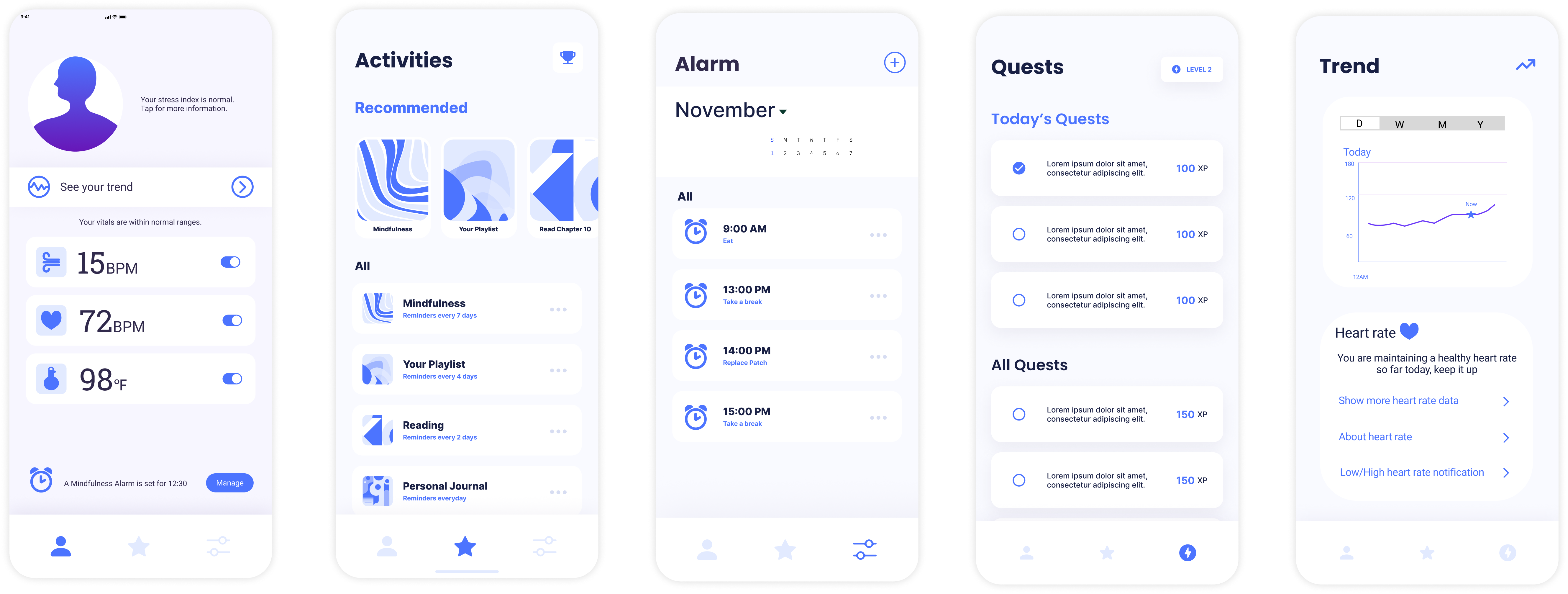 The Patch is a lightweight wearable containing a smart sensory chip that measures key physiological indicators and visualizes both current readings and potential symptoms. Complementing this, the Mindfulness Alarm app provides responsive notifications that prompt users to check in with their mental state and offers tailored suggestions to support emotional well-being.