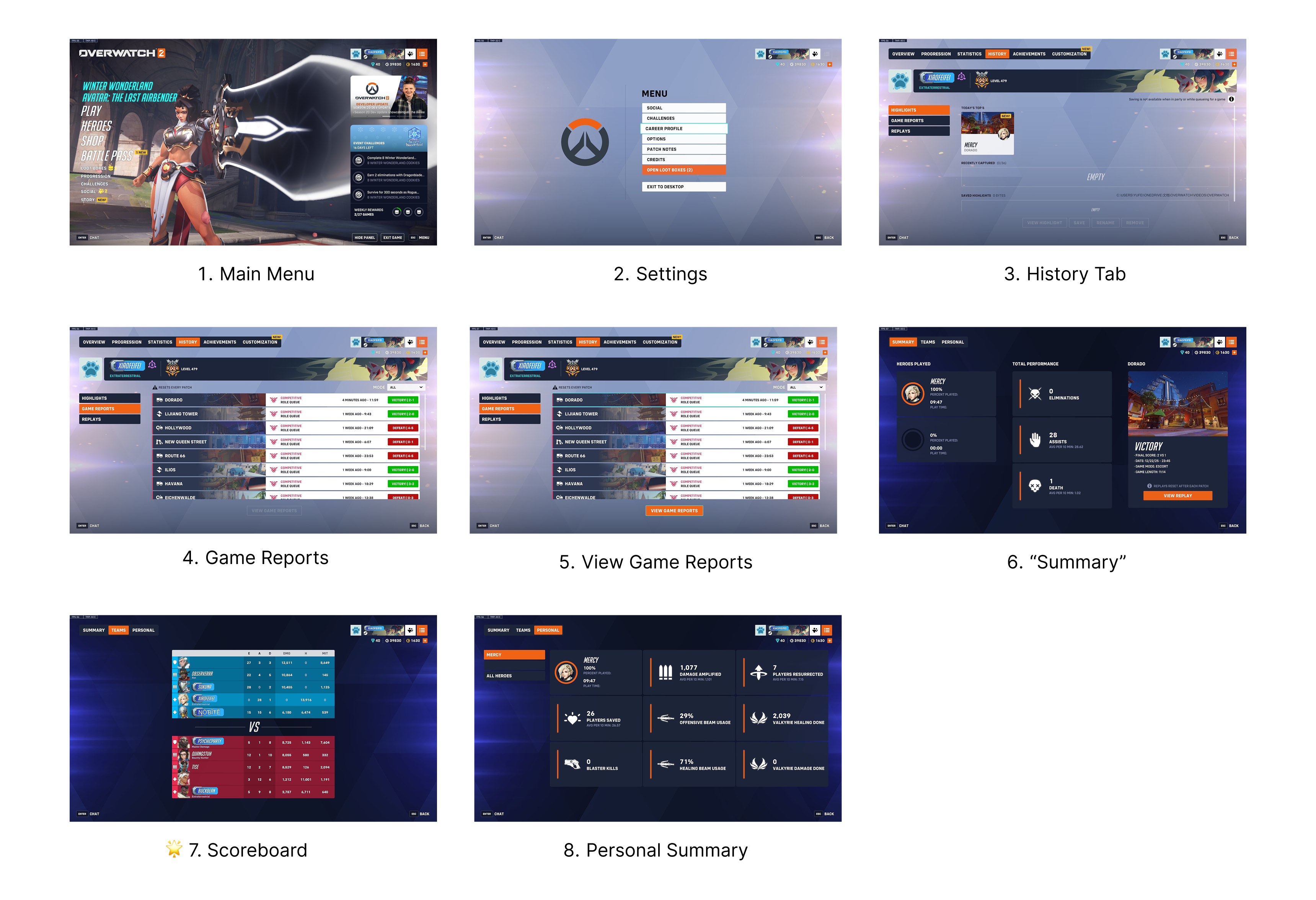 While reviewing discussions in the Overwatch community on Reddit, I identified navigation as a recurring pain point for players. Many users found difficulty browsing and understanding their match history due to information being fragmented across multiple tabs. Then I conducted a guerrilla usability study with 5 Overwatch players and analyzed media coverage, critic reviews, and community feedback to uncover the following issues: