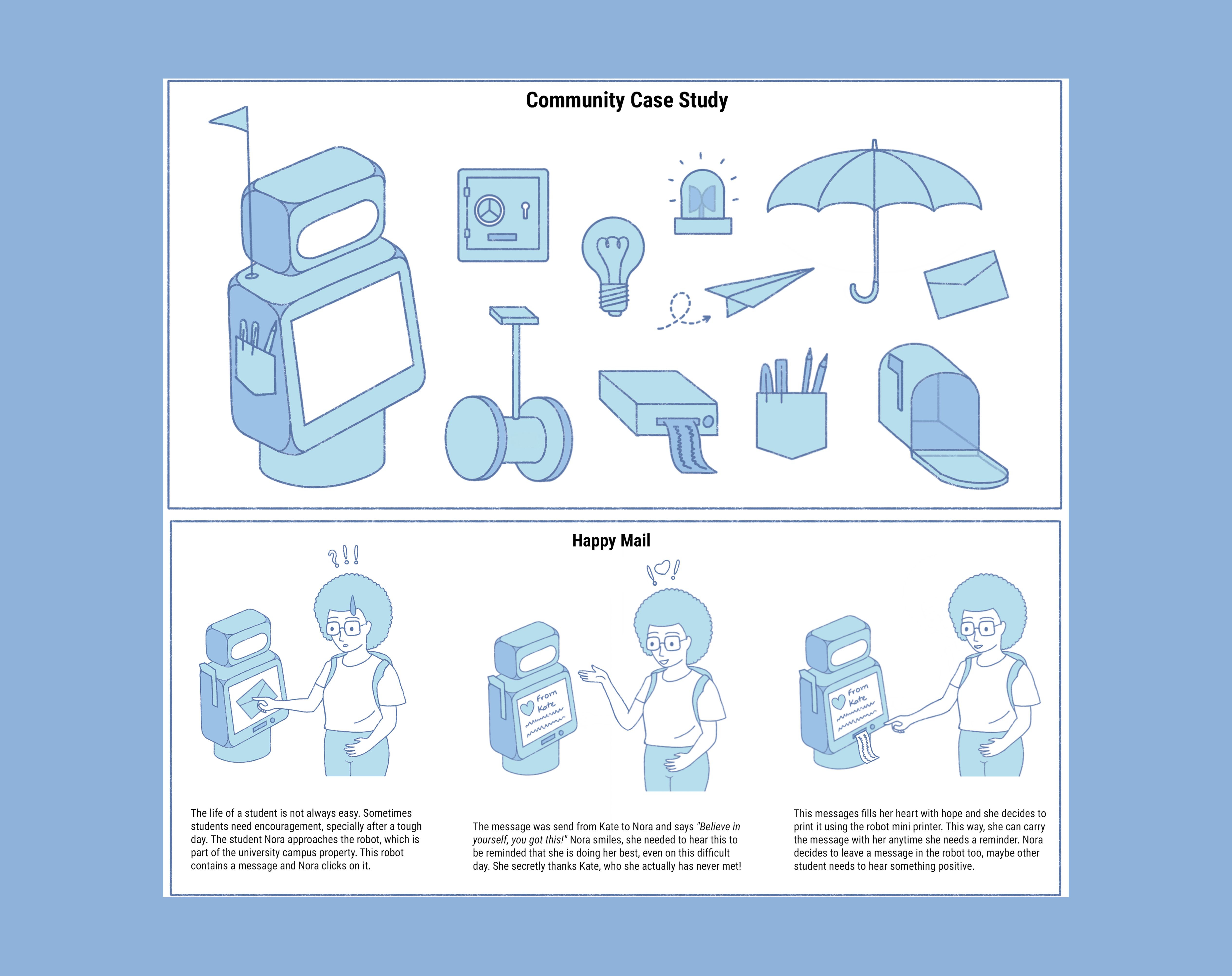 We ideated a messenger robot with the function of sending and receiving message from strangers. People are able to input messages for public and others walk by later can see the message left by previous people. We want to explore if this design can help to foster a positive atmosphere in university and strengthen connection among people.